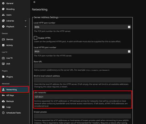However, when running under Docker, the IP addresses that Jellyfin will use is by the Docker specification a LAN address. Reading the comment underneath the "LAN networks" section, Jellyfin states that iff. the field is left blank, then all RFC1918 addresses (LAN addresses) are considered local. In turn, given that Docker containers internally all have RFC1918 addresses, that means that under Docker any and all connections to the Jellyfin container will be considered local, even if the connection is NAT-ed from the Internet.