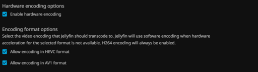 that would indicate that most of the codecs that are displayed in the Jellyfin settings are actually hard-ware backed when using the Jellyfin Rockchip MPP acceleration such that the illustrated settings in the following image seems appropriate.