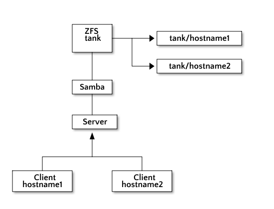 For all machines that will benefit from the shared storage, the filesystems have to be set up using ZFS. Conversely, any machine that will not have a ZFS filesystem created will be denied access to the pool. Effectively, creating the setup this way delegates access to ZFS which is the last component in the setup and makes Samba oblivious to the underlying filesystem properties. One advantage therefore is that ZFS features can be leveraged without even having to modify the Samba configuration that acts as a passthrough.