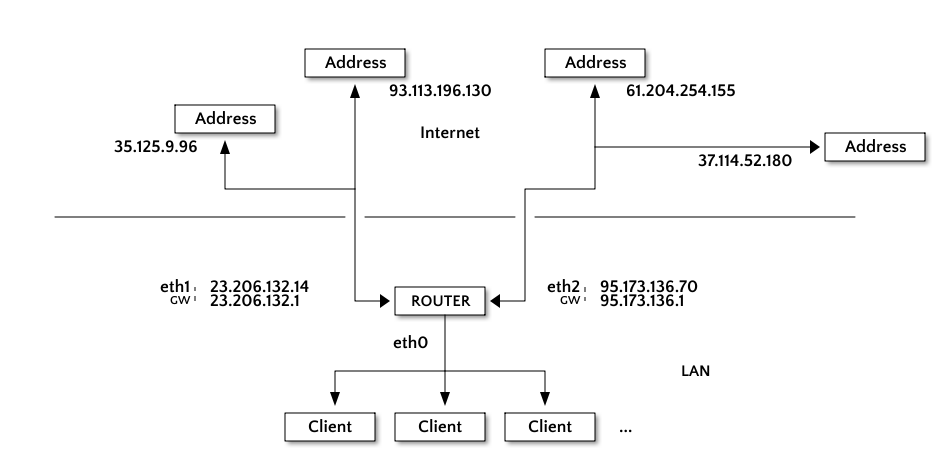 For that purpose, Linux advanced routing is used, notably the ability to route and distribute packets out of different interfaces. The downside of the presented approach, for instance, contrasted to BGP routing, is that active connections over links that fail will fail as well and will need to be rebuilt - in essence, this affects statefull protocols where established connections have to be maintained but will affect stateless protocols (such as HTTP) somewhat less.