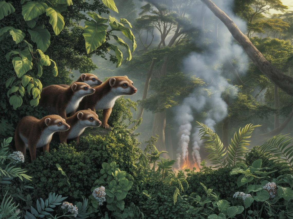 ideogram.ai, A photograph depicting a family of miacids nestled high within the dense foliage of a prehistoric African forest during the Paleocene epoch. The miacids, small, weasel-like mammals with sleek brown fur and inquisitive eyes, peer intently toward a distant stand of trees. Wisps of pale grey smoke curl upwards through the lush green canopy, hinting at an unseen fire, while dappled sunlight filters through the ancient leaves. The forest floor below is a tangle of giant ferns and early flowering plants, creating a vibrant yet slightly ominous scene.
