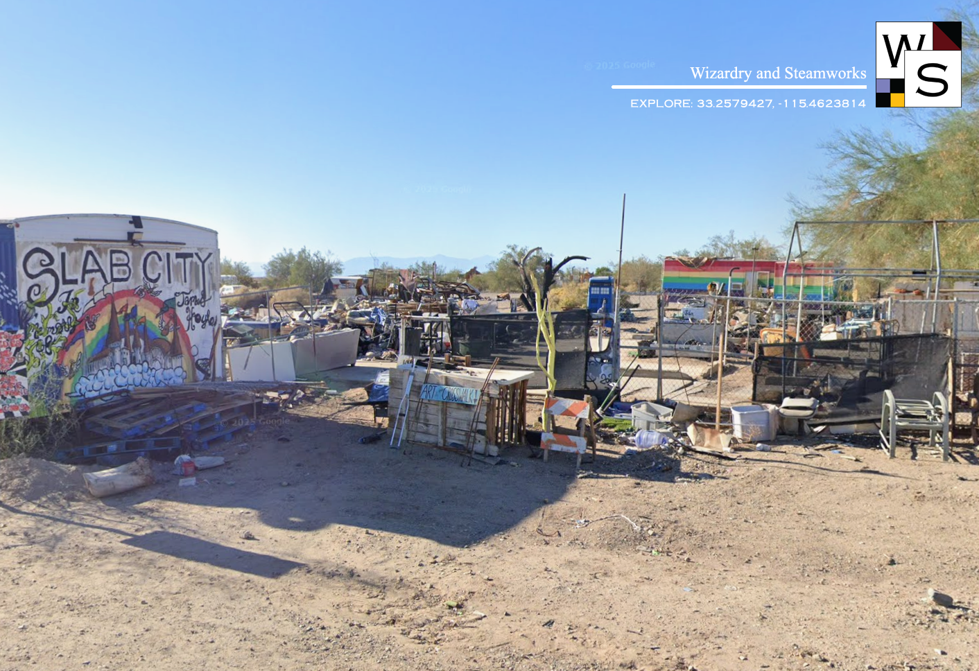 The art reminds one of "Lord of the Flies" or any other Robinsonade, as well as depicting a post-apocalyptic scene, similar to Fallout, the games, particularly 1 or 2, which, in reality have the same idea in mind but in a different setting. We'd argue that there is a lot of native art encoded in all the works, with the whole park, for example, resembling the same time of "ensemble" or "collage" of pointillist elements that are arranged together in very similar patterns. Where native Americans perhaps used river-stones to fashion a meticulous mandala, the Slab City artists use various technological components in place of stones, yet the same artistic effect is achieved to an observer.