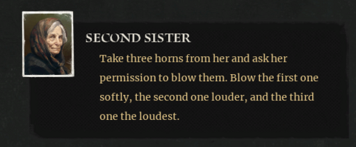 The sequence is mostly straightforward but there is an easy mistake that can be done by not noticing that the second sister says to first ask the third sister for permission before blowing any horns and instead going ahead thinking that only the horn sequence is important. Note that the multiple-choice question has the option to ask for permission, such that that's the option that must be chosen first.
