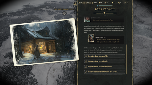 The mythical Baba Yaga appears three times in the game as sisters of herself with the last one being the final appearance. If the player persists in the dialog and picks to stay every time Baba Yaga shows up as a random event, the second sister will offer a hint and then vanish.