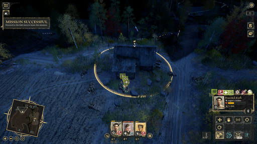 The trick here is that the whole battalion of enemy soldiers can just be maimed a little by the scout with the sniper rifle and kited a little out of range of the hut. Once the enemy soldiers are maimed, they sort-of change priority so they forget about setting the hut on fire and, after vainly searching for the player units, will just sit around aimlessly. Funnily, after a while, the soldiers will just get bored and run off, forgetting entirely to set the hut on fire. When the time runs out, the mission is considered successful even though the player just maimed the soldiers away from the hut a little without killing them.