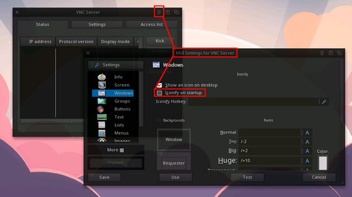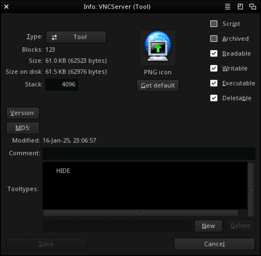 The application in the image, namely "VNC Server" will now start iconified on the desktop but in order for the interface to not show, the HIDE tooltype, as per the "VNC Server" documentation, is set on the application. Without HIDE the application will still show on startup. Now with both the HIDE tooltype set and iconify being enabled by MUI, MorphOS will boot with "VNC Server" running and iconified on the desktop.