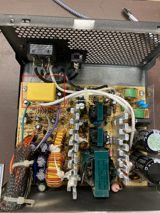 The capacitor is just soldered onto the pins of the kettle cable connector. Also, looking closer, a resistor can be observed across the bottom part of the capacitor. Both of these together constitute the circuit mentioned above. Power supplies like these are normally produced in mass and sometimes, depending on which jurisdiction they are shipped to, they must be adapted to ensure that they have the required parameters. For instance, different countries enforce different levels of RF noise. It might be the case that this power supply has been adjusted in post-processing and the filter added in order to reduce the EMI / RFI in order to meet requirements.