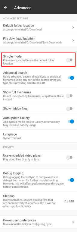 The mobile clients for Android and Apple mobile devices are configured to run in "simple mode", which implies that all added shares will be stored to a fixed location on the device. Sometimes however it is needed to add a share on top of an existing folder in order to allow the folder to synchronize.