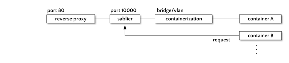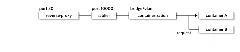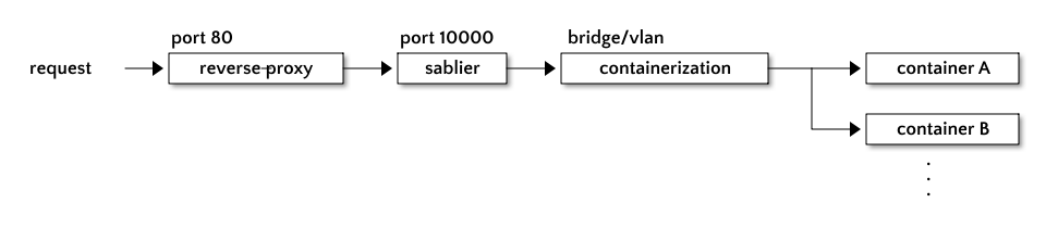 where a request arrives and is then routed by a reverse-proxy like traefik onto sablier which then reaches a target container, possibly by waking up the container via sablier.