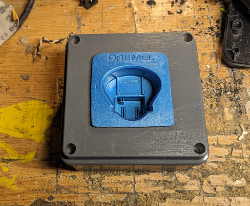 A hole is drilled into the new box as well in order to fit the Dremel socket and faceplate inside.