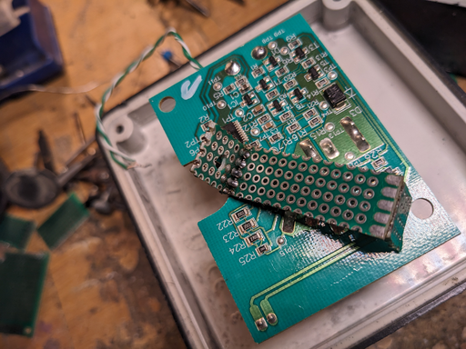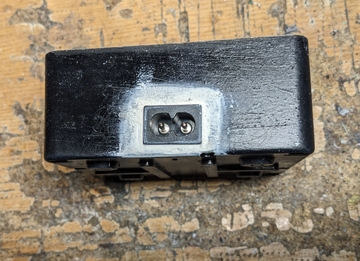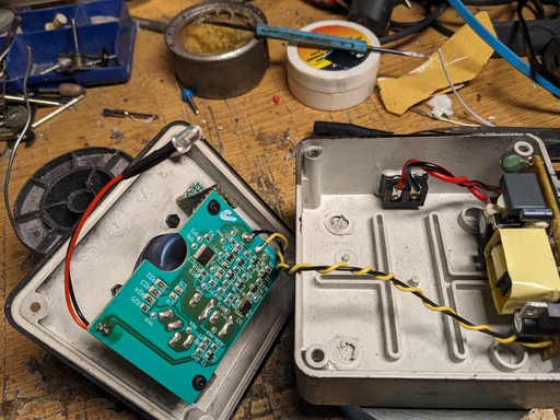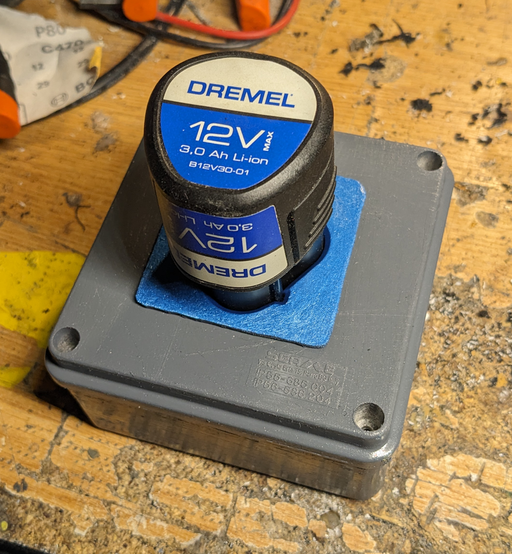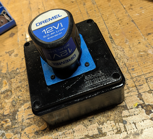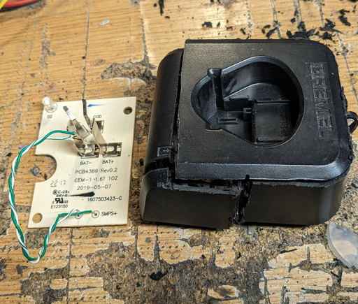 Now with the painting out of the way, the circuit has to be moved inside the box. This means cannibalizing the Dremel power supply and finding a way to mount the charger circuit on the bottom of the socket cutout. The mounting struts were cut while carving the socket out so new ones have to be created. Interestingly, we settled for creating struts out of PCB leftovers that were first soldered together and then glued.