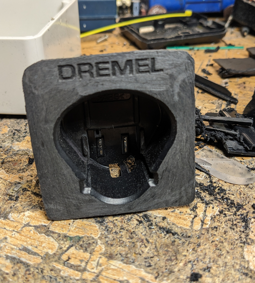 An idea is to fuse the charger and the base together for an all-in-one solution. Clearly, a box is needed in order to fit both components and to relocate the circuitry. Furthermore, the Dremel base is a solid mold that will have to somehow be cut up and then fitted onto the new box.