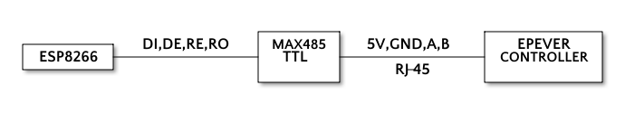 Vcc ( ) | orange | It has been noted by some that the Epever controller provides but for the Epever 40A the power provided via the EJ-45 jack seems to be which is perfect for powering the ESP8266 as well as the MAX485 TTL module. |