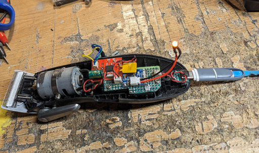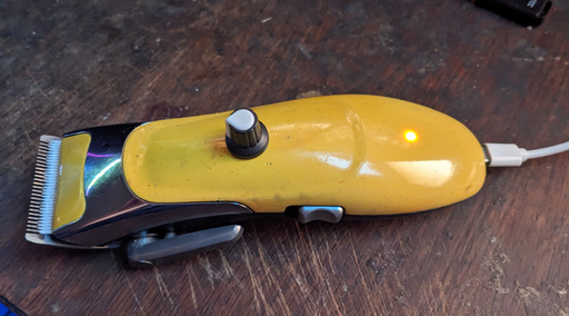 Of course, the cap comes on top in order to hide the metal shaft that controls the speed. Along with the new speed feature, there's an implicit feature inherited from the new circuit, namely the fact that the trimmer can be used while it is being charged. One of the shortcomings of the original was that the hair trimmer could only be used after its batter was charged and keeping the clipper plugged in did not work because its internal charging circuit would turn off the clipper. With that said, the new build and circuit now allows a long charging USB cable to be plugged in while the clipper is being used. This is massively much better than the original because it often happens to forget about charging such that picking up the clipper and just starting to trim did not work before unless the batteries were already charged. Now, even for a saloon, when a customer walks in and the clipper has no batteries, it's extremely inconvenient to make them wait for the clipper to charge. With this modification, a long USB cable can be used and the hair trimmer is ready to work.