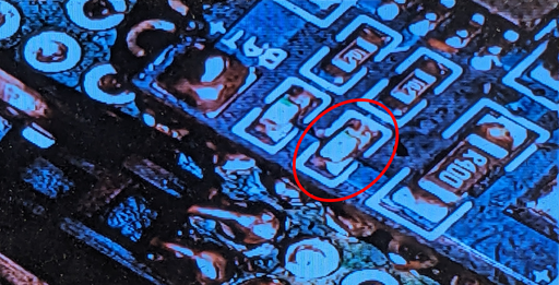 The result looks great! It would be nice though to have a charging indicator because the old one has been removed. In order to do so, first the LED on the charging board is desoldered under the microscope. These are surface-mounted LEDs and there's two of them on the board. One of them is the charging indicator which is the lower one in the image.