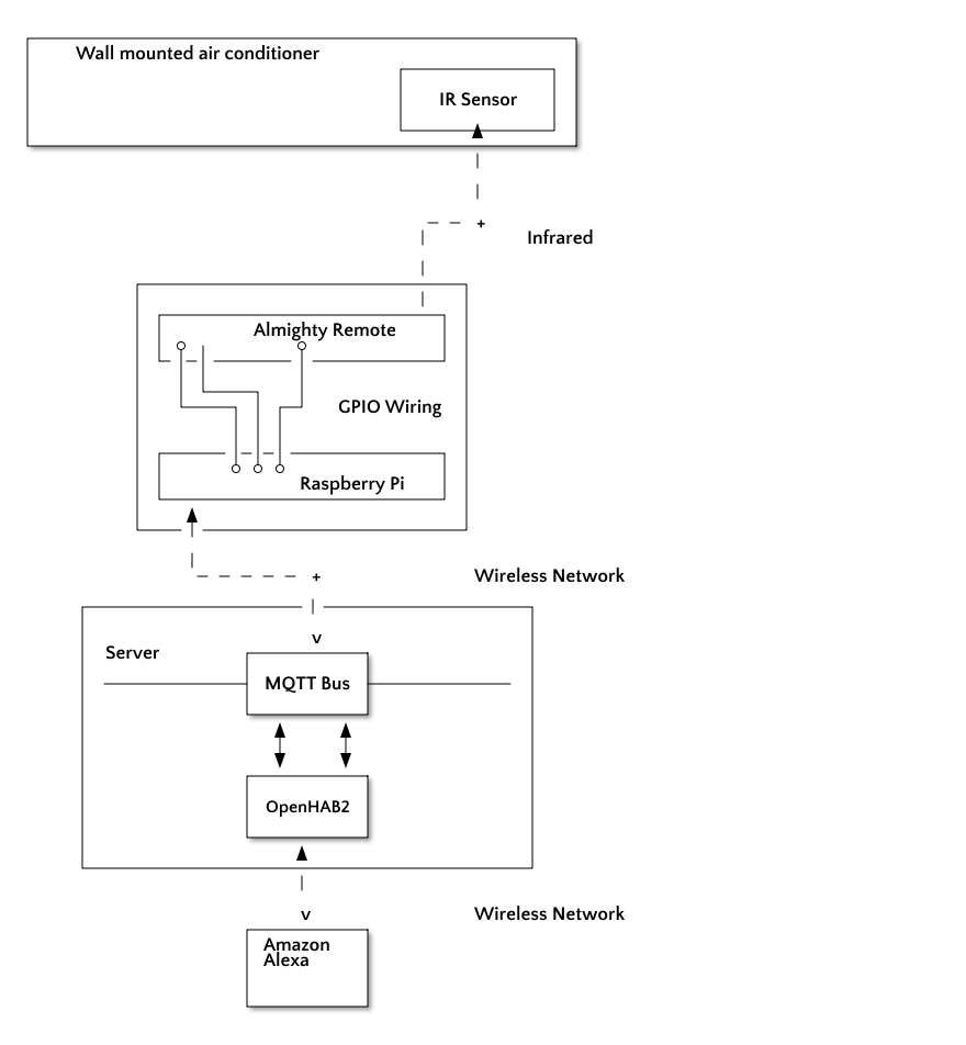 With the software running, OpenHAB2 can be used on the server as glue in order to be able to turn the air conditioner on or off using voice commands.