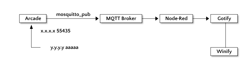 When designing an arcade cabinet that is running a Linux-based operating system, it is somewhat convenient to have messages relayed to some IoT device in order to be notified whenever certain events occur. As netplay for retroarch is currently designed, in order to play a multiplayer game, a user starts a hosting session and various other users connect to the netplay session. Hosting a netplay session will announce the game and the address to a lobby such that connecting users browsing the available games will see the game and then connect. However, waiting for a random player to join can take time such that all the attention cannot be permanently focused on the arcade machine.