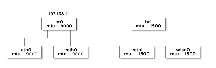 Similarly, since veth0 will belong to the wired / jumbo frame capable bridge, jumbo frames are enabled on the virtual Ethernet interface veth0 but not on the virtual Ethernet interface that connects to the bridge br1 meant to work with non-jumbo frame capable interfaces.
