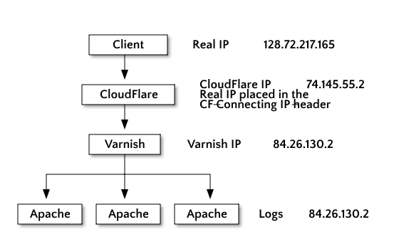 When the client wants to connect to your server, it passes through CloudFlare. CloudFlare takes the real IP address of the client and places it in the CF-Connecting-IP header whilst passing on the CloudFlare IP address to the Varnish server. Varnish will then connect to the Apache backends and pass the Varnish IP address to Apache such that the logs will display accesses from Varnish - which is a very far stretch from the client's real IP address.