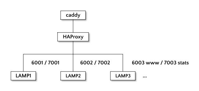 Caddy is going to forward all the requests to HAProxy, that, in turn, will forward to the LAMP containers behind HAProxy. The ports with a 6 as a prefix, 6001 to 6005 (not depicted) will be used to serve content whereas the ports with a 7 prefix will answer with a percentage indicating to HAProxy how busy the server is.