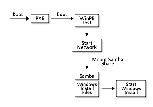 /mnt/boot.wim/Windows/System32/startnet.cmd file to contain the following and make sure to change the settings at the top of the file:@echo off wpeinit rem -- The server with the Samba share containing the Windows install. set INSTALL_SERVER=pxe rem -- The name of the Samba share containg the Windows install. set INSTALL_SHARE=pxe-windows7 rem -- The account credentials for the Samba share. set INSTALL_ACCOUNT=pxe set INSTALL_PASSWORD=pxe rem -- Get the default gateway. for /f "tokens=*" %%s in ('ipconfig ^| find /n "Default Gateway"') do ( set NETCONFIG=%%s ) for /f "tokens=2 delims=:" %%s in ("%NETCONFIG%") do ( set GATEWAY=%%s ) rem -- Remove spaces around the gateway. set GATEWAY=%GATEWAY: =% ping %GATEWAY% -n 3 -w 1000 > NUL ping %INSTALL_SERVER% > NUL net use W: \\%INSTALL_SERVER%\%INSTALL_SHARE% /user:%INSTALL_ACCOUNT% %INSTALL_PASSWORD% W:setup.exe
