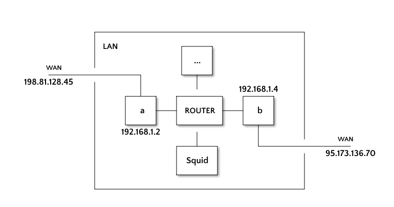 The final step to make sure is that on the LAN clients with WAN IP addresses a and b the traffic from the internal network is masqueraded using iptables. For instance, if client a would have eth0 as the WAN IP address 198.81.128.45, we would write: