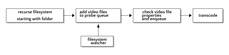 mediainfo or ffprobe will be used to check whether the video files already have the requested parameters in order to not transcode a video file twice if it already has the necessary settings,ffmpeg will be used to transcode the files to the desired settings,The flow essentially relies on two queues that are filled dynamically as files are being detected or scanned: