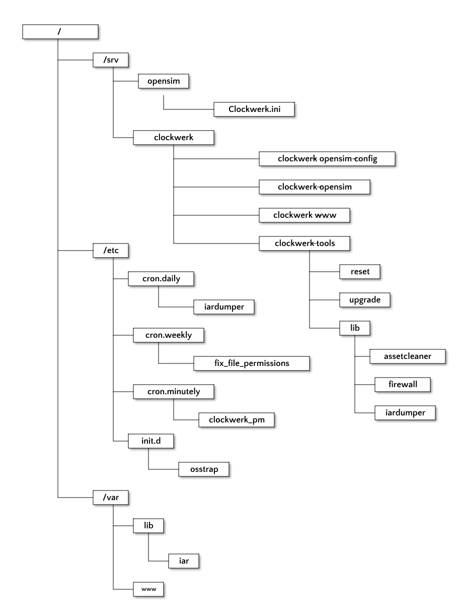 jfs filesystem.clockwerk-upgrade, clockwerk-reset and clockwerk-configure commands that can be issued from login without changing directories.opensim to /srv/opensim./srv/clockwerk.Clockwerk is the next generation of a self-contained Virtual Machine created and maintained by the Wizardry and Steamworks group that is configured and optimised to run a standalone hypergrid instance of OpenSim. OpenSim is not scalable when it comes to providing services to a large number of users. For example, when running a single instance of OpenSim and providing services to multiple users by allocating regions for them, the resource consumption seems to have a quadratic progression, where more and more resources are consumed, even for the slightest functionality of OpenSim. As an example of poor design is the fact that, by default, assets (images, audio clips, etc...) are never purged from the users' inventory, even if the users trash them and purge them in-world.