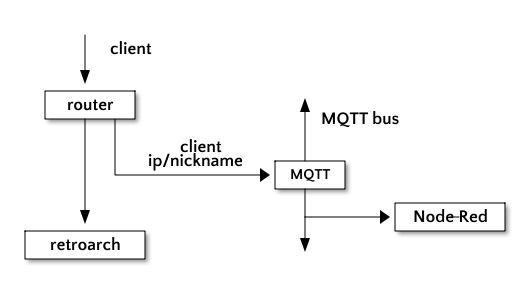 The whole system will consist in a node.js script that shall be ran on the router in order to intercept TCP/Ip netplay traffic, extract the packet and send the nickname and IP address pair to an MQTT server. Node-Red and dataflow programming will be leveraged in order to subscribe to the MQTT server and receive the data sent by the node.js script in order to perform a geographic lookup of the IP address and then display the results on a rendered world map.