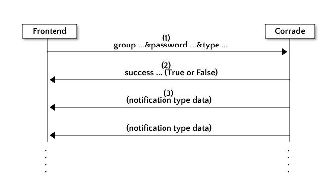 The protocol is built onto the already existing Corrade communication semantics. Here is a rough sketch of how the initial handshake and the ensuing communication between a frontend and Corrade takes place:
